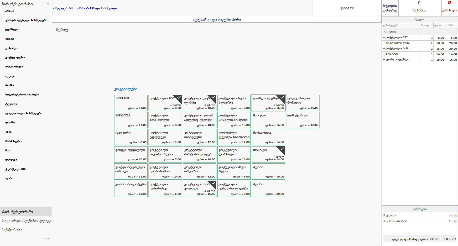 კაფე-რესტორნის მოდულის გამოყენება შესაძლებელია, როგორც დიდ და მრავალდარბაზიან რესტორანებში, ისე პატარა კაფეებსა და სწრაფი კვების ობიექტებში. პროგრამის მომხმარებელი ადგენს მენიუს, იღებს შეკვეთებს, ანაწილებს მაგიდის და დარბაზების სახეობებს, რაც ფინანსური აღრიცხვის მოდულში გატარებების სახით ავტომატურად აისახება.
